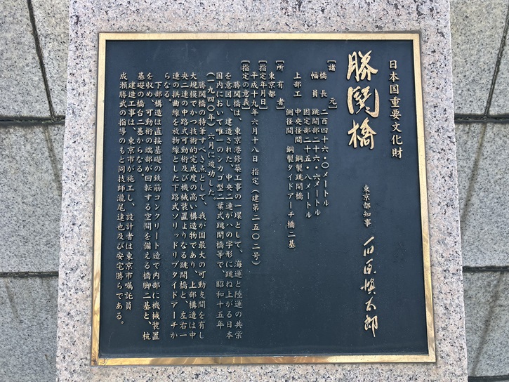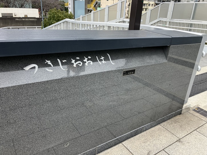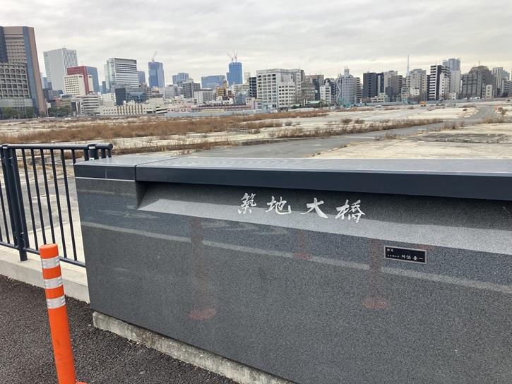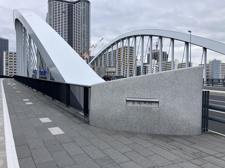 築地大橋は、環二通りが隅田川を渡る橋梁です。隅田川の最も下流にあり、平成二十七年度に完成した最も新しい橋です。頭上に横繋ぎ材の無い開放感がある鋼3径間連続中路式アーチ橋で、平成三十年度の土木学会田中賞を受賞しています。橋長は245mで、幅員は32.3m〜48.0mあります。橋名の揮毫は、当時の都知事だった舛添要一氏です。橋のあちこちに舛添要一氏のプレートが貼られています。