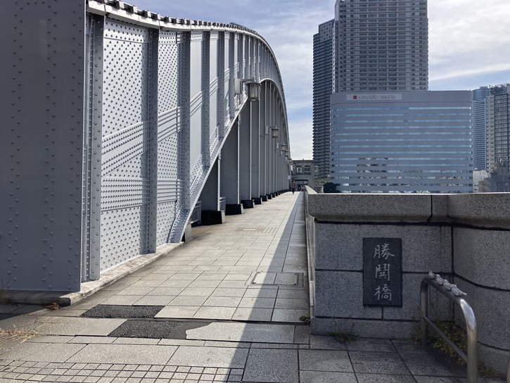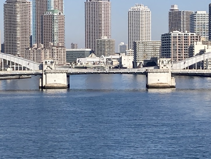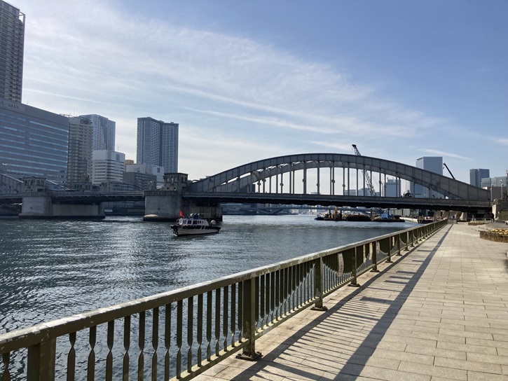 歩道からは、直ぐ上流に架かっている勝鬨橋が眺められます。中央二連の跳開部が正面から見れるのはここだけでしょう。