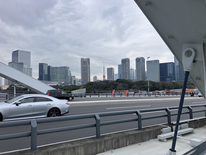 橋からは高層ビルが連なる都心の風景が一望できます。浜離宮や東京タワーも見えますね。