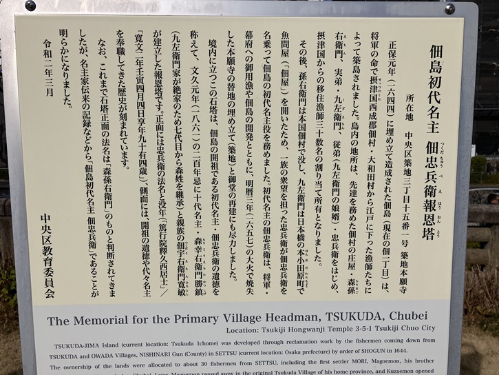 正保元年(1644年)に埋め立て造成された個島(現在の佃一丁目)は、将軍の命で摂津国西成郡佃村・大和田村から江戸に下った漁師たちによって築島されました。島内の地所は、先達を務めた個村の庄屋・森孫右衛門・実弟九左衛門・従弟(九左衛門の娘婿)忠兵衛をはじめ、摂津国からの移住漁師三十数名の割り当て所有となりました。その後、孫右衛門は本国佃村で没し、九左衛門は日本橋の本小田原町で魚問屋(「佃屋」)を開いたため、一族の衆望を担った忠兵衛が個忠兵衛を名乗って佃島の初代名主役を務めました。初代名主の佃忠兵衛は、将軍・幕府への御用漁や佃島の開発とともに、明暦三年(1657年)の大火で焼失した本願寺の替地の埋め立て(築地)と御堂の再建にも尽カしました。境内に立つこの石塔は、佃島の開祖である初代名主・佃忠兵衛の遺徳を称えて、文久元年(1861年)の二百年忌に十代名主・森幸右衛門勝鎮(九左衛門家が絶家のため七代目から森姓を継承)と親族の佃宇右衛門寛敏が建立した報恩塔です。正面には忠兵衛の法名と没年(「篤行院釋久西居士」/「寛文二年壬寅四月四日享年九十有四歳」)、側面には、開祖の遺徳や代々名主を奉職してきた歴史が刻まれています。なお、これまで石塔正面の法名は「森孫右衛門」のものと判断されてきましたが、名主家伝来の記録などから「佃島初代名主 佃忠兵衛」であることが明らかになりました。