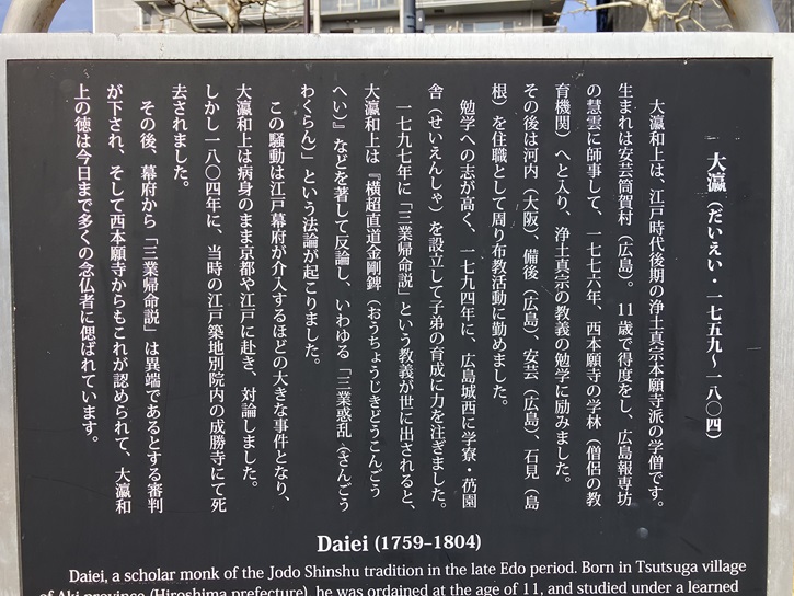 Daiei, a scholar monk of the Jodo Shinshu tradition in the late Edo period. Born in Tsutsuga village of Aki province (Hiroshima prefecture), he was ordained at the age of 11, and studied under a learned priest Eun at Hosenbo temple in Hiroshima. In 1776, he enrolled at a Hongwanji-affiliate educational institution for priests known as Gakurin, to deepen his understanding of the Jodo Shinshu teaching. After completion of his study at the institution, he served various temples in western Japan, including