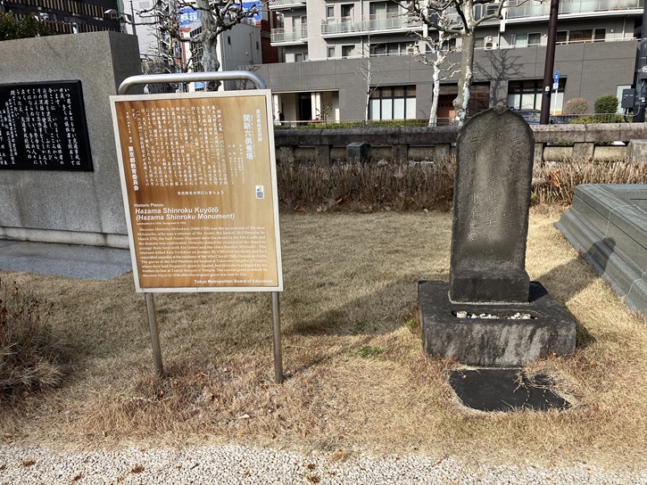 Hazama Shinroku Mitsukaze (1680-1703) was the second son of Hazama Mitsunobu, who was a retainer of the Asano, the lord of Ako Domain. In March 1701, the lord Asano Naganori drew his sword in the Edo Castle and the domain was confiscated. Shinroku joined the retainers of the Asamo to avenge their lord with his father and the elder brother Mitsuoki. The retainers killed Kira Yoshihisa on January 30, 1703 (Ako Incident), and they committed seppuku at the residence of the Mori Clan of Chofu Domain in Azabu. The graves of the Ako Warriors are located at Takanawa Sengaku-ji Temple, where their lord Naganori's grave is located, but Shinroku was buried by his brother-in-law at Tsukiji Hongan-ji Temple. The current grave is rebuilt by Hazama Sogen in 1834 after the original grave was lost by fire.