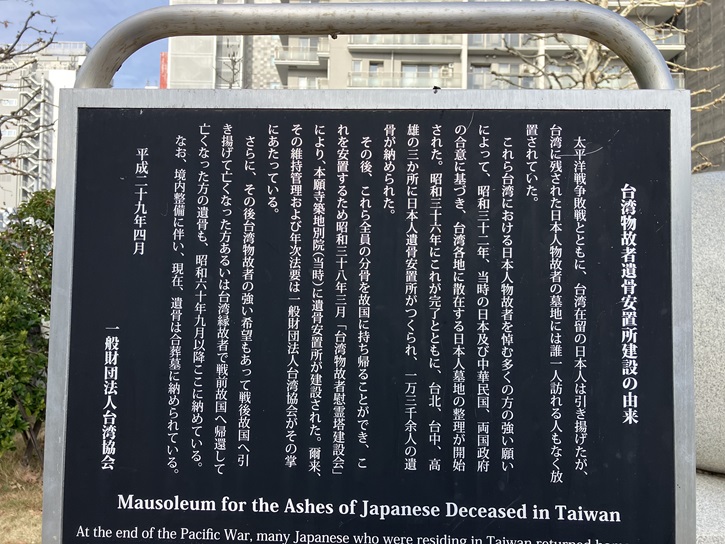 At the end of the Pacific War, many Japanese who were residing in Taiwan returned home while some remained. The gravesites of the Japanese in Taiwan had since been neglected and unmaintained. Responding to the many concerns received, in 1957, the then governments of Japan and Republic of China mutually agreed to conduct a survey to locate the graves of Japanese who were interred throughout Taiwan. When the survey was completed in 1961, mausoleums were built in three Taiwan cities including Taipei, Taichung and Kaohsiung, to house the remains of approximately thirteen thousand deceased Japanese. Approval was later granted to bring a portion of each person' s remains back to Japan and in March 1963, columbarium was built by the Association for the Building of a Memorial Monument Remembering the Japanese Deceased in Taiwan. Since then, the Mausoleum has been maintained by the Japan-Taiwan Association, which also conducts annual memorial services for the deceased. In accommodating request made by their relatives, beginning September 1985, it was approved that the remains of those who died after returning to Japan either before or after the war also be interred in the mausoleum. Following the ground development around the west gate, their ashes have since been relocated to the joint cemetery.