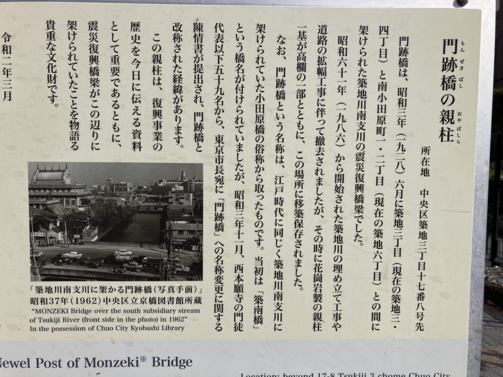 築地本願寺から勝鬨橋に向かって晴海通りを進みます。かって、築地川南支流が晴海通りと交差する地点には門跡橋が架かっていました。その親柱が駐車場入口横に展示されています。巨大な石柱で、壁面には「昭和三年六月 復興局建造」というプレートが埋め込まれています。門跡橋の名称にはいろいろな変遷があったようです。