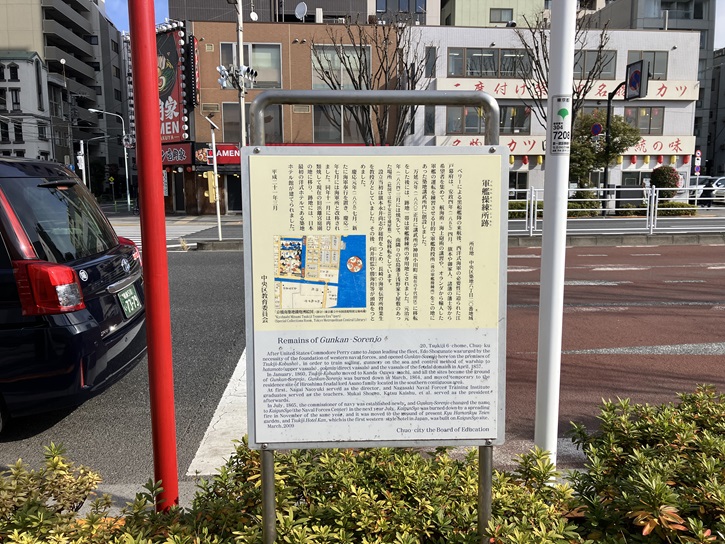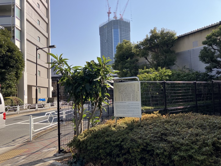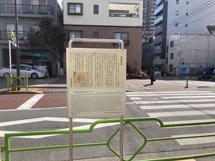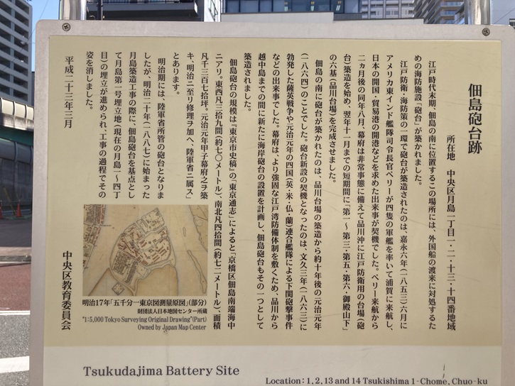 佃大橋東詰で橋から下りますと、「佃島砲台跡」の案内板が立っています。