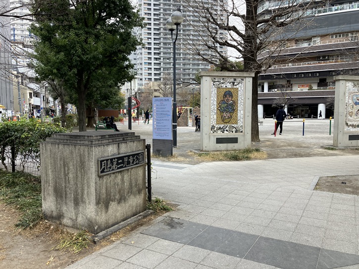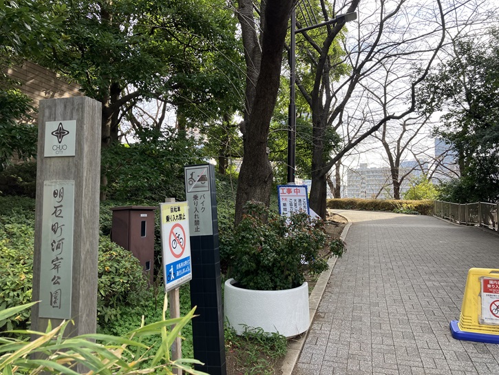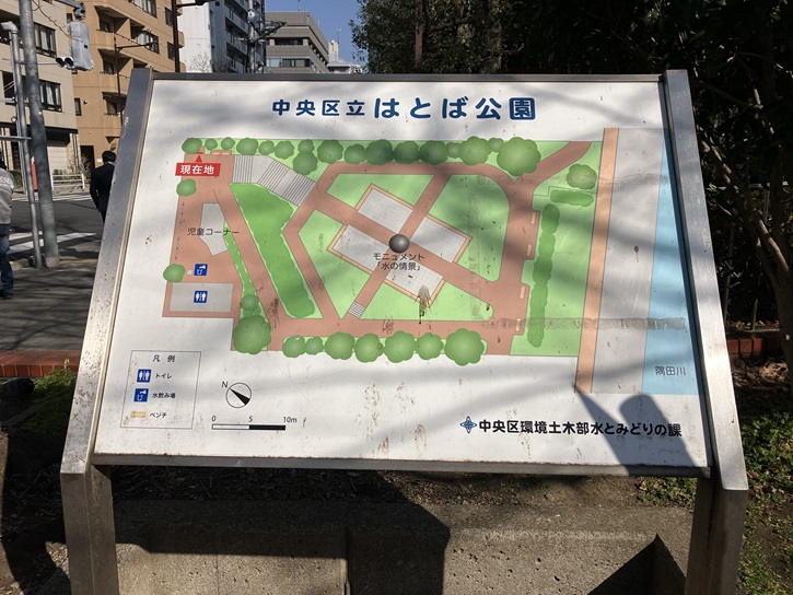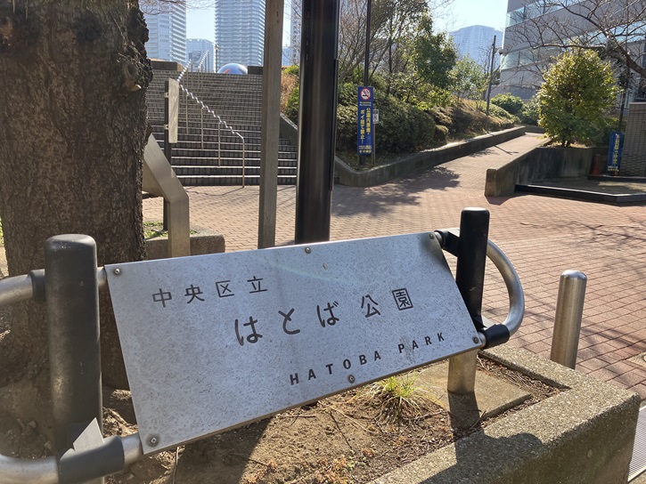 中央区立はとば公園の所で遊歩道も行き止まりとなり、公園の中を通って一般道に下ります。