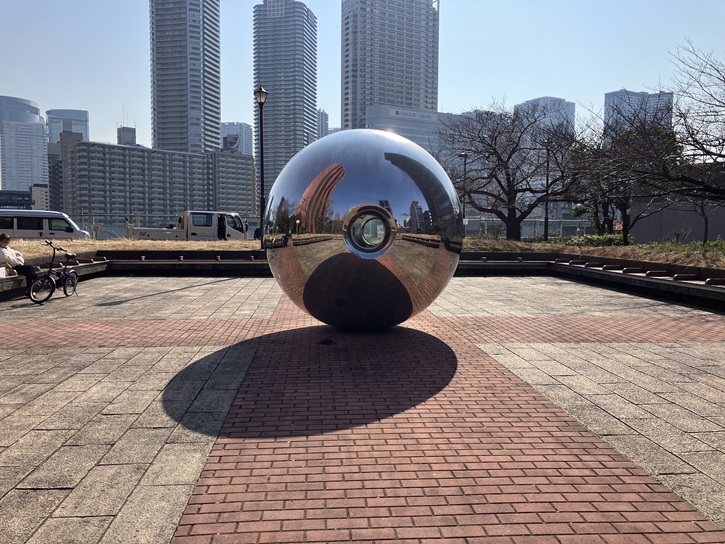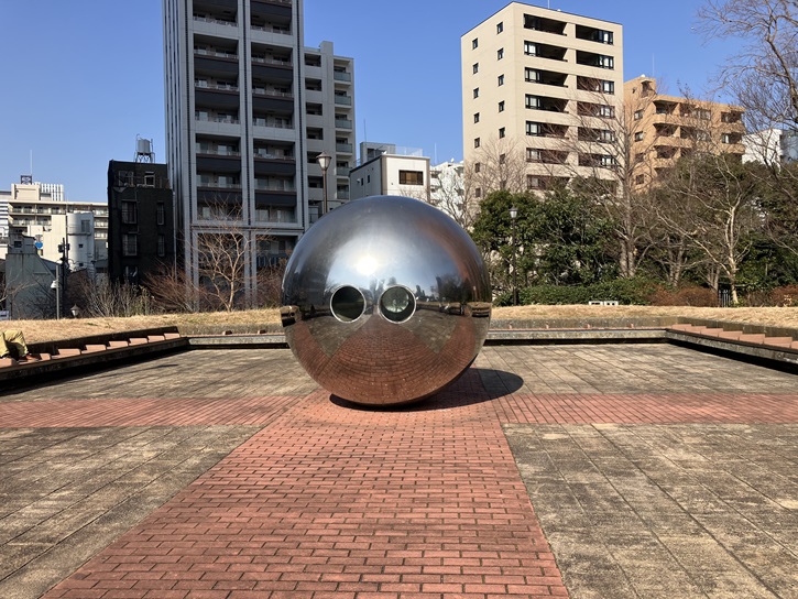 広場の真ん中に、銀色に輝く大きな球体のモニュメントが置かれています。井上武吉という彫刻家の作品で、「my sky hole 水の情景」というのだそうです。片方から見ると穴はひとつですが、反対側からみると穴がふたつになっています。作品のテーマがよく分かりません。