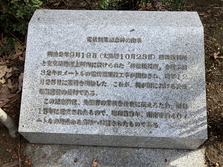 明治二年9月19日(太陽暦10月23日)横浜裁判所と東京築地運上所内に設けられた「傳信機役所」を結ぶ約32キロメートルの電信線架設工事が開始され、同年12月25日に業務を開始した。これが、我が国における公衆電気通信の最初である。この記念碑は、先駆者の業績を後世に伝えるため、昭和十五年に建立されたもので、昭和五十三年、南南東約40メートルの地点から当地へ移設されたものである