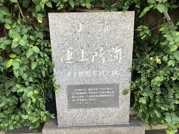 治作の門前に、「東京税関発祥之地」という石碑が建っています。幕末期に鎖国政策が廃止され、横浜などが開港された安政六年(1859年)、長崎・横浜・函館 の3か所に「運上所」が開設され、外交事務や運上の事務を扱うことになりました。「運上」というのは、江戸時代に商工業者が払う税金の一種で、今風に言えば「取引税」のようなものでした。開港場に設置された「運上所」は関税を取り立てる役所でした。江戸の運上所は、慶応三年(1868年)にこの地に設けられました。「税関」という役所名が使われ始めたのは明治五年(1872年)からで、関東地方には横浜に横浜税関が置かれました。戦後の昭和二十八年(1953年)に「横浜税関東京税関支署」が廃止され、「東京税関」に生まれ変わりました。