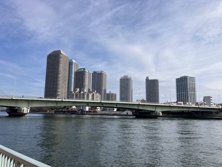 朝潮運河北端の橋からは、運河沿いにある晴海と月島の街並みが一望できます。