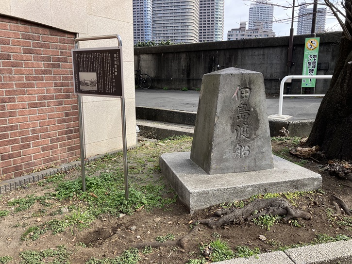 佃大橋西詰の高架下角地に、「佃島渡船場跡」の案内板が立っています。