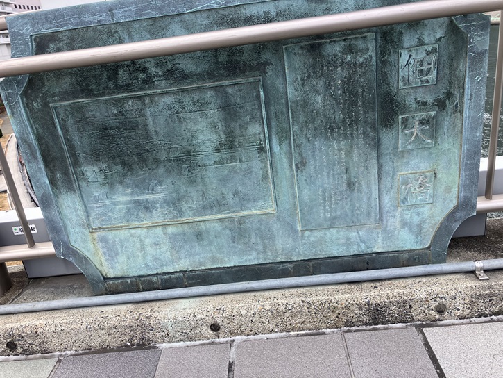 佃大橋の欄干に、佃大橋の由来らしき解説文と昔の隅田川の風景を描いた銅板が貼られていますが、文字は読み取れません。