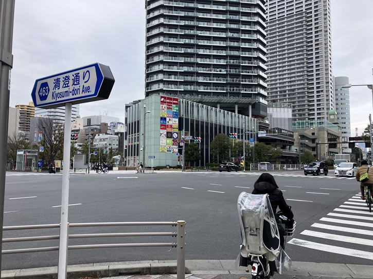 春海橋西交差点を右折して、新月島公園を回り込むようにして進み、月島第三小学校前で左折します。