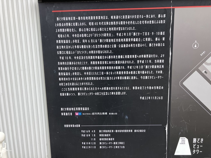 勝どき駅前地区第一種市街地再開発事業地区は、晴海通りと清澄通りが交差する一角にあり、都心部との接点の要衝に位置しながら、昭和四十年代以降は無秩序な開発や老朽化した住宅等の密集による防災上の問題が顕在化し、都心立地に相応しい新たな土地利用が望まれていました。昭和六十三年、中央区の指導により「まちづくり研究会」、平成二年3月「勝どき一丁目8・9・10番区再開発協議会」が発足。同年6月には「勝どき駅前地区市街地再開発準備組合」に発展し、都心・駅前立地を活かした多様な機能を持つ生活空間の創出と公園・公益施設の再生を図るべく、勝どきの新たな玄関口に相応しい「まちづくり」の検討が重ねられました。平成十年、中央区及び当再開発準備組合から都市再生機構に再開発事業への参画要請を行い、より具体的な計画が示されたことで、再開発事業実現に向けた機運が高まりました。翌平成十一年、当再開発事業の施行予定者として機構の勝どき駅前再開発事務所が組織され、平成十二年3月「勝どき駅前地区再開発協議会」が発足し、中央区とともに三位一体となって再開発事業の推進に取り組みました。その後、権利者の方々をはじめ多くの事業関係者の努力と協力により事業は順調に進捗し、今日勝どきビュータワーの竣工の日を迎えることができました。ここに当再開発事業に携わられた方々への感謝の意を表するとともに、事業の完了と今後の当地区の発展を願いつつ、勝どきビュータワーの竣工を記念して碑を設置します。