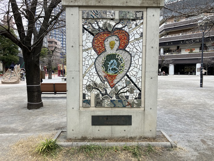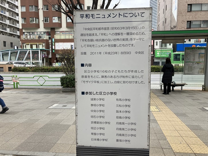 「中央区平和都市宣言(昭和六十三年3月15日)」の趣旨を踏まえ、「平和」への理解を一層深めるため、「平和を願い核兵器のない世界の実現」をテーマとして平和モニュメントを設置したものです。
