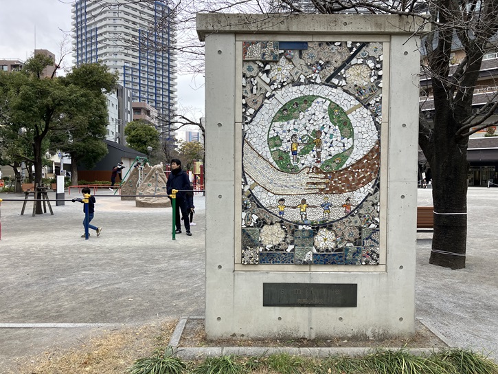 公園には、勝どきビュータワーが隣接しています。エントランスの天井には奇妙な人魚が貼り付いています。「マナティ2010」と題した人魚とも称されるマナティのモニュメントは、人間と野生、水と陸を結ぶ架け橋とされています。親子のマナティが地域の絆やふれあい、平和や環境の保全を象徴しているのだそうです。