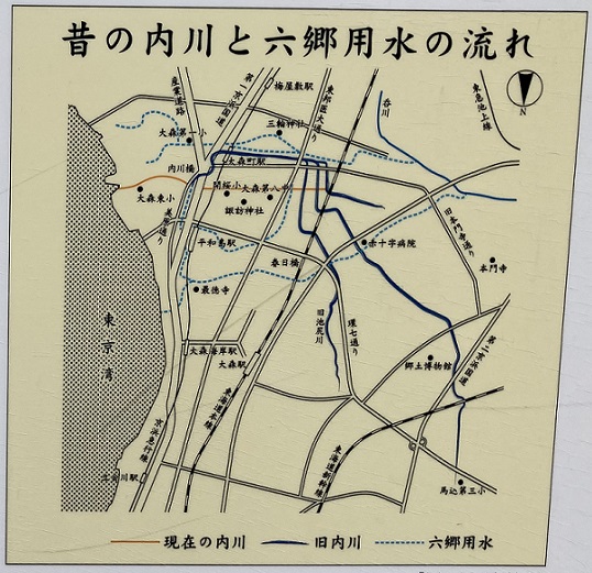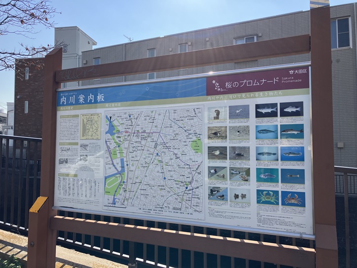 内川は大田区を流れる、全長1.55km・流域面積3.25平方キロメートルの河川です。大田区大森西四丁目のJR東海道本線橋下から大森学園高等学校前を流れ、京浜運河・東京湾に注いでいます。元々は北馬込付近を水源とした天然の小川でした。現在では東海道本線より上流は暗渠化して下水道の幹線になり、それより下流が河川法上の指定区間となっています。そのため大雨が降ると下水が流れ出て悪臭が酷く、通常時は曝気装置や微生物養生により水質が若干ではありますが改善してきています。かつては六郷用水の流れの一部が大森第八中学校付近で合流していたり、呑川の分流が合流していましたが、現在では合流する河川もなく、通常時の開渠部分の水は潮の干満による海水・汽水がほとんどを占めています。開渠の最上流部でも潮がひいているときには川底の泥に汽水性のヤマトオサガニ・クロベンケイガニ・ケフサイソガニが見られます。また、マハゼやボラも多く、夏には多くの釣り人が訪れます。エイなど多くの海洋性の魚類も上げ潮時には遡上しています。平成十九年(2007年)4月にウォーターフロント事業として、河口付近に大森ふるさとの浜辺公園が開園しました。また、一部開渠部の流れに沿って散歩道が作られています。橋の袂に案内板が立っています。