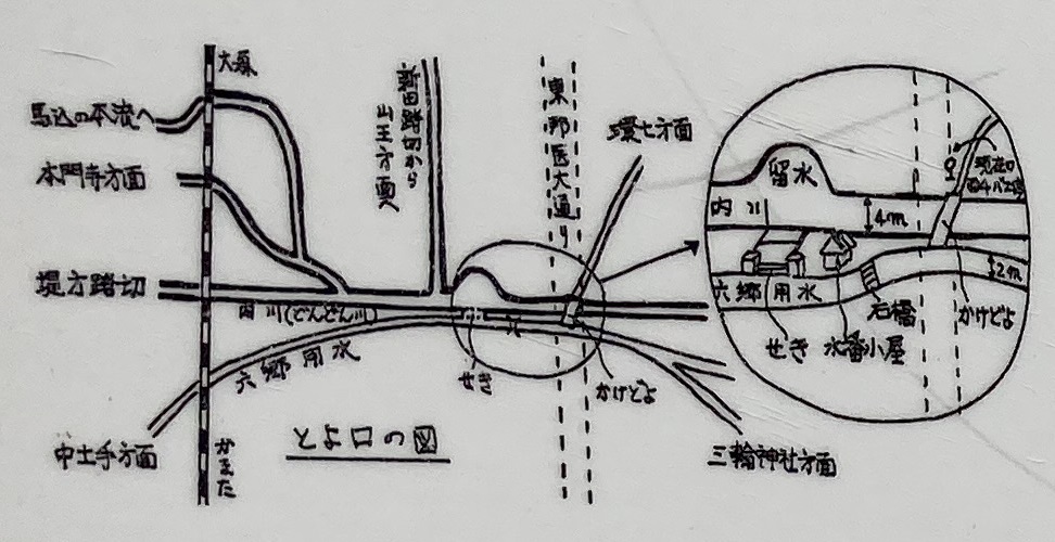 馬込や山王の木原山にみなもとを持つ内川は、大森町の山谷通りと、東邦医大通りの交差する大森西四丁目のバス停近くでいっしょになっていました。このあたりの内川は水の量が多く、流れが速かったので「ドンドン川」とか、「ドンドンびき」などと言われていました。今の大森四丁目のバス停あたりにとよをかけ、諏訪神社や浅間神社のある大森西二丁目側に水を送ったので、かけどよのあったこのあたりをとよ口と呼んでいました。