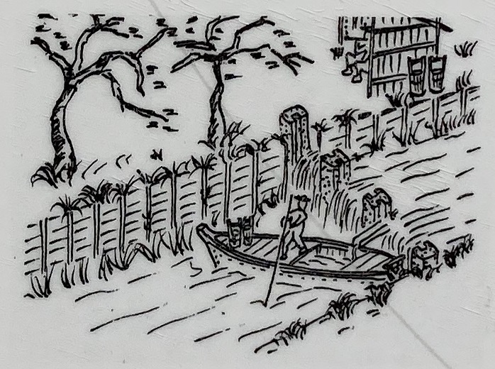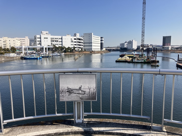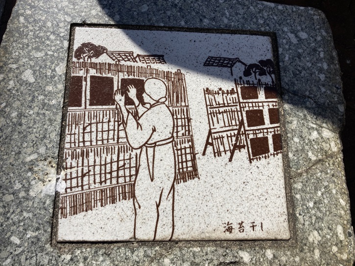 橋の欄干には、かっての海苔採りや海苔干しの風景を描いたプレートが貼られています。