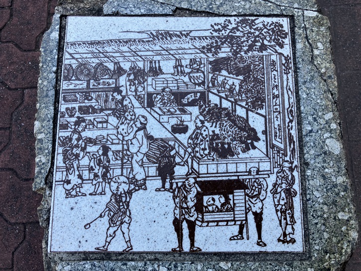 美原通りのかっての賑わいを描いた石盤が歩道に敷かれています。商店のシャッターには、旧東海道のお茶屋さんも描かれています。