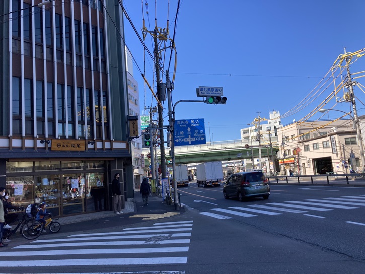 美原通りは環七美原通り交差点で環七と交差します。交差点の角にも海苔屋さんがあります。寛文九年(1797年)の創業だそうです。