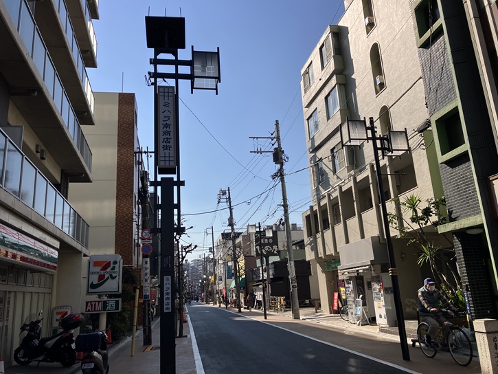 大森スポーツセンター前交差点を右折し、美原通りに入ります。大正七年(1918年)の第一京浜国道建設工事の際に旧東海道が拡張されましたが、美原通りは商店街だったために、第一京浜は商店街を避けたルートとなり、美原通りは今でも旧東海道の面影を残しています。