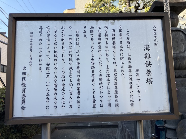 この石塔は、大森の海岸に流れ着いた死者を供養するために建立された。海難供養塔としては、東京湾沿岸屈指の規模を持つものであり、また埋立てによって周辺の環境が変わったが、この場所がかつては海際であったことを物語る存在としても貴重である。台座には、江戸や神奈川の魚貝業者をはじめ、一般の江戸町民や武士など約三百人に及ぶ名が刻まれており、この塔が地元の人ばかりでなく広い地域のいろいろな階層の人々の協力寄進によって、安政二年(1855年)に再建されたことがわかる。