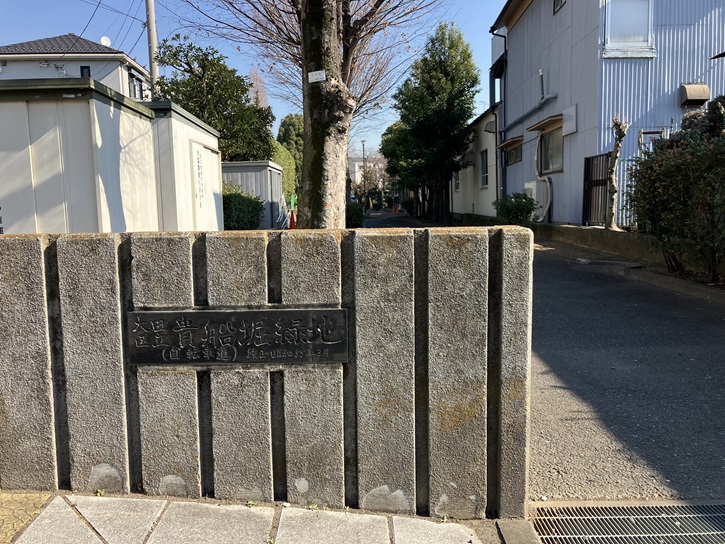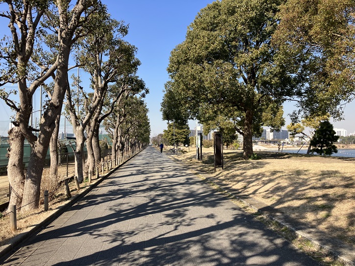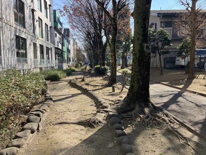 東京ガス大森グラウンドの西側に遊歩道が通っています。かっての貴船堀を埋め立てた跡に造成された緑道です。南北に500mほど延びていて、途中でT字型に曲がっています。