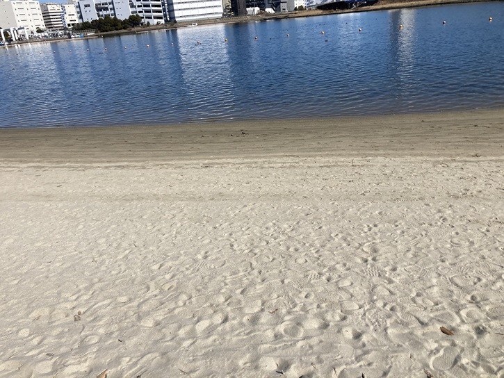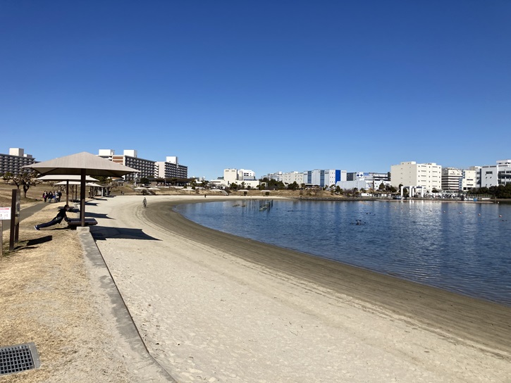 海辺には、かっての大森海岸を再現した人工の砂浜が造られ、彎曲した海岸線は南国のビーチを思い浮かべます。小豆島の白砂を使用したのだそうです。