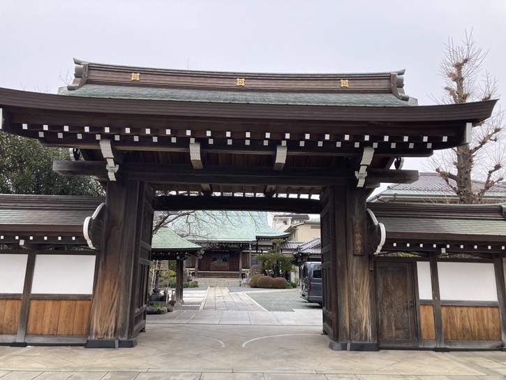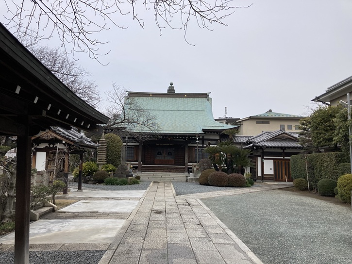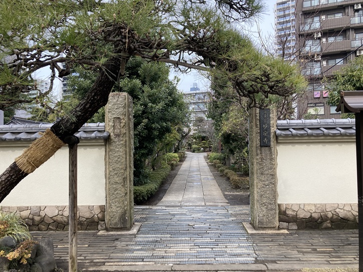 少し戻った角に、円頓寺があります。小田原北条氏分国の頃、荏原郡南部に行方氏という豪族がいました。行方氏は最初は上杉氏の家人でしたが、後に北条氏に属し、永禄年間(1558年〜1569年)の弾正明連の代には八幡塚・高畑・吉川・町屋・道塚・雑色の6郷と大師河原を合せて361貫24文の地の領主でした。明連の子孫は修理亮義安・弾正忠直清と引続きこの地を知行していましたが、直清は天正十八年(1590年)に北条氏が滅亡した際に小田原攻めの先鋒上杉景勝・前田利家等の諸将の軍と戦い、一門の郎党と共にその館において討死しました。直清の弟は池上本願寺に逃れ出家して日芸と名乗り、文禄元年(1592年)に日芸は兄弾正忠直清と一門の追善菩握のために旧館跡に1宇を建立し、寺名を直清の法名である性光院殿円安行頓日方居士からとって性光山円頓寺と号しました。