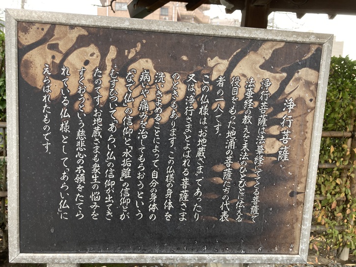 浄行菩薩は法華経にでてくる菩薩で、法華経の教えを末法のひとびとに伝える役目をもった地涌の菩薩たちの代表者の一人です。この仏様は“お地蔵さま”であったり、又は“浄行さま”とよばれる菩薩さまのときもあります。この仏様の身体を洗いきよめることによって、自分の身体の病いや痛みを治してもらおうという「なで仏」の信仰と「水垢離」の信仰とがむすびついて「あらい仏」の信仰が出てきたのです。お地蔵さまも衆生の悩みをすくおうという慈悲心の本願をたてられている仏様として「あらい仏」にえらばれたものです。