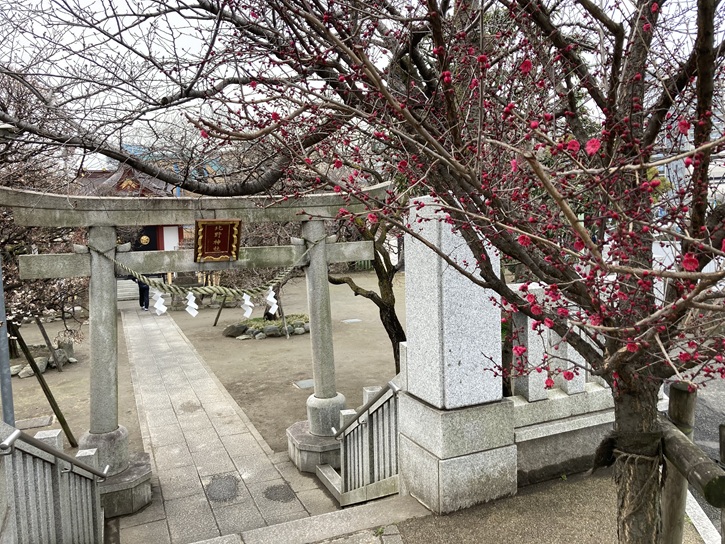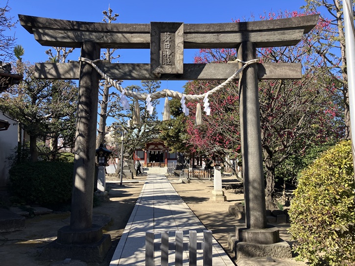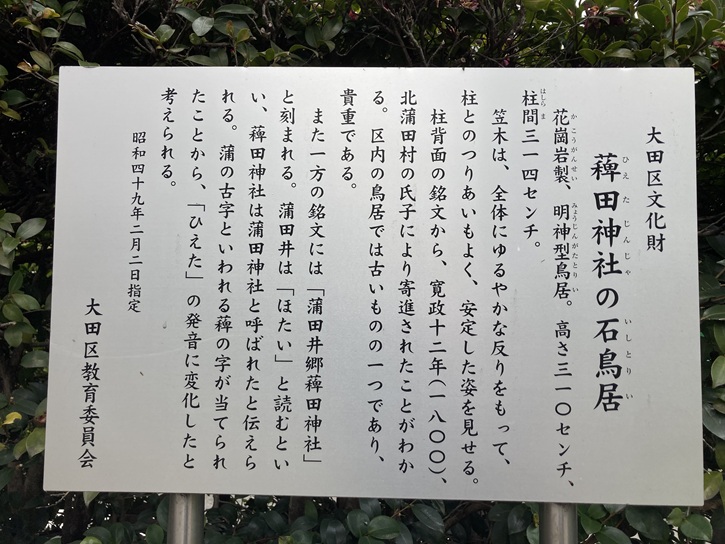 境内の入口に建つ石鳥居は大田区内でも古いもののひとつで、寛政十二年(1800年)に北蒲田村の氏子によって寄進され、区の文化財にも指定されています。