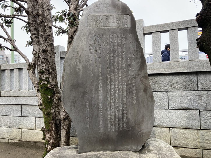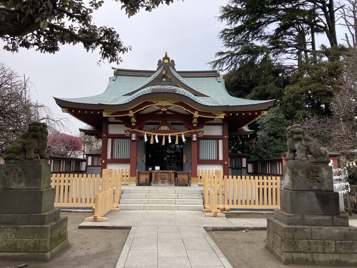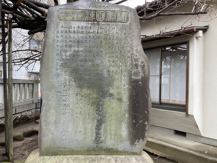 社殿は昭和二十年(1945年)の戦災で焼失しましたが、昭和二十九年(1954年)に再建され、平成十二年(2000年)に鉄筋コンクリート造の現在の社殿に造り替えられました。社殿の前には、昭和三十四年(1959年)に奉納された狛犬が境内を悪い気から守っています。神社の由緒を記した巨大な石碑が建っています。