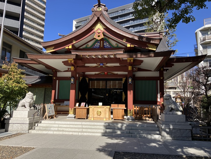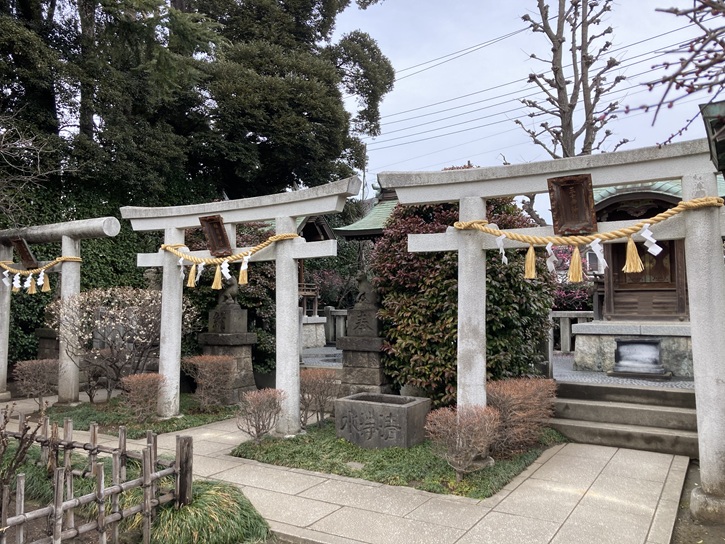 社殿の右側には境内社が並び、左から薬祖神社・稲荷神社・三十番神社が鎮座しています。薬祖神社には地主神が祀られていると伝わっています。稲荷神社には伏見稲荷大社と同じ宇迦御魂命が祀られています。三十番神社には国家や国民などを守護するとされた三十柱の神々が祀られています。