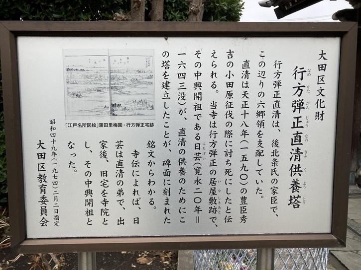 行方弾正直清は、後北条氏の家臣で、この辺りの六郷領を支配していた。直清は天正十八年(1590年)の豊臣秀吉の小田原征伐の際に討ち死にしたと伝えられる。当寺は行方弾正の居屋敷跡で、その中興開祖である日芸(寛永二十年=1643年没)が、直清の供養のためにこの塔を建立したことが、碑面に刻まれた銘文からわかる。寺伝によれば、日芸は直清の弟で、出家後、旧宅を寺院とし、その中興開祖となった。
