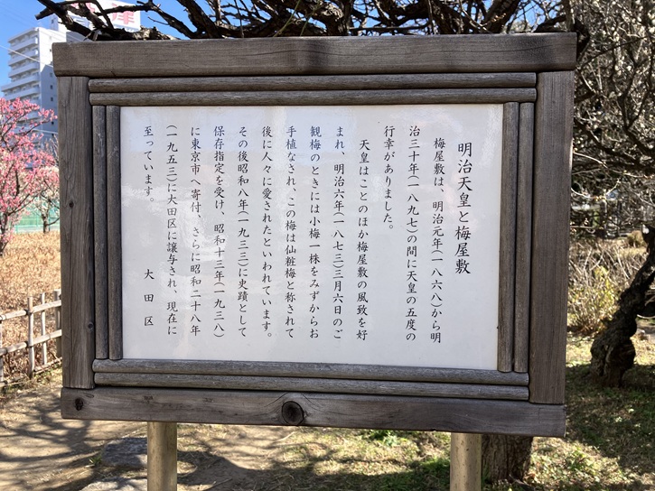 梅屋敷は、明治元年(1868年)から明治三十年(1897年)の間に天皇の五度の行幸がありました。天皇はことのほか梅屋敷の風致を好まれ、明治六年(1873年)三月六日のご観梅のときには小梅一株をみずからお手植なされ、この梅は仙粧梅と称されて後に人々に愛されたといわれています。その後昭和八年(1933年)に史蹟として保存指定を受け、昭和十三年(1938年)に東京市へ寄付、さらに昭和二十八年(1953年)に大田区に譲与され、現在に至っています。