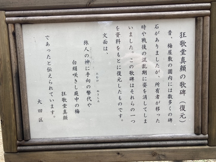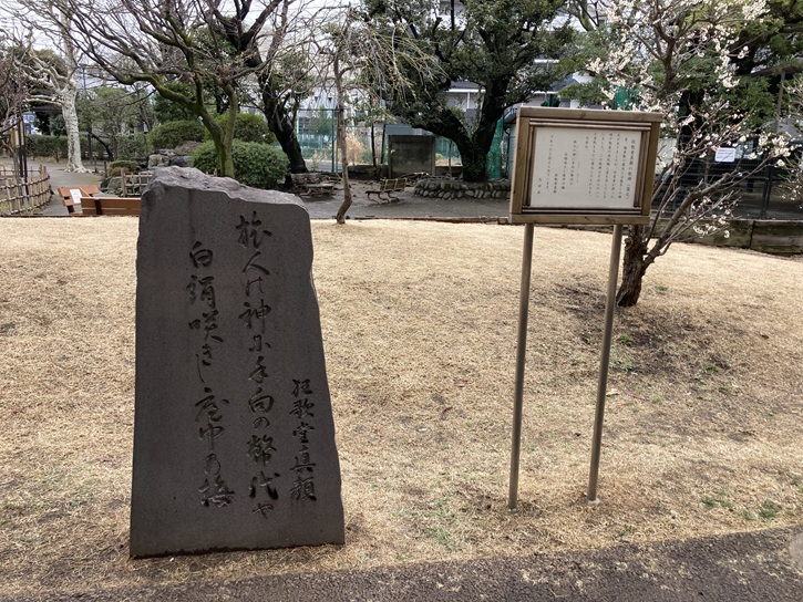 昔、梅屋敷の園内には数多くの碑石がありましたが、所有者が移った時や戦後の混乱期に姿を消してしまいました。この歌碑はそれらの一つを資料をもとに復元したものです。文面は、