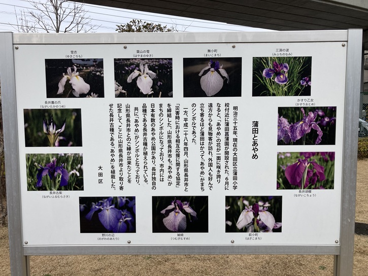 明治三十五年、現在の大田区立蒲田小学校付近に蒲田菖蒲園が開設された。6月になると、「あやめ」の花が一面に咲き誇り、遠方からも見物客が訪れ、外国人も好んで立ち寄るほど蒲田はかつて「あやめ」がまちのシンボルであった。一方、平成二十八年四月、山形県長井市と「災害時における相互応援に関する協定」を締結した。山形県長井市も「あやめ」がまちのシンボルになっており、市内には日本有数のあやめ公園があり、長井独自の品種である長井古種が植えられている。共に「あやめ」がシンボルとなっており、山形県長井市とのご縁が出来たことを記念して、ここに山形県長井市より取り寄せた長井古種である「あやめ」を植栽した。