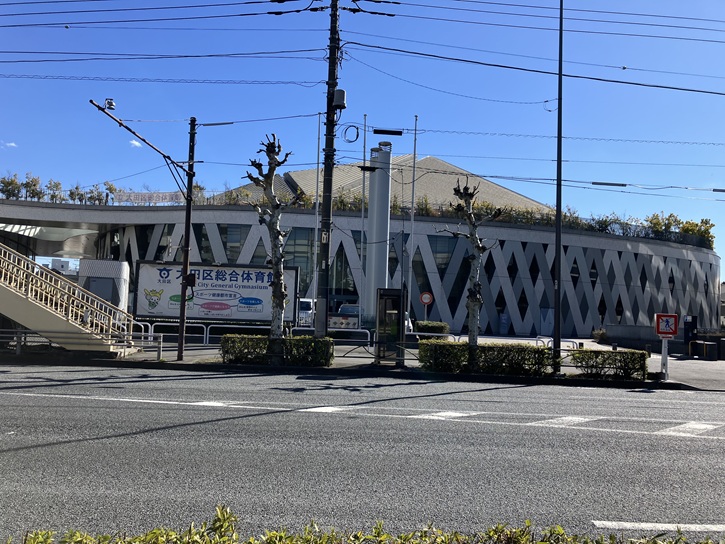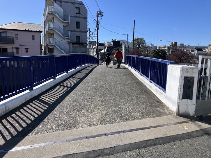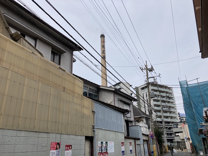 聖蹟蒲田梅屋敷公園を出て第一京浜を歩道橋で渡り、大田区総合体育館を回り込んで路地を抜けて呑川に向かいます。大正湯の高い煙突が目印です。
