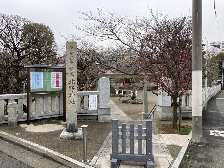 寛文元年(1661年)、北蒲田村の杉原重右衛門が邸内に諏訪神社を勧請しました。その後、呑川の洪水によって、池上の麓の天神山の森から矢口村が祀っていた天神様の御神体が度々流されて杉原重右衛門の邸宅前に流れ着きました。杉原家ではその都度矢口村に天神様を返しましたが、ついにそれが七度目になったため、嘉永二年(1849年)に矢口村と話し合い、杉原家邸内の諏訪神社の傍らに社を建てて蒲田井府天満宮と称しました。明治六年(1873年)、諏訪神社は北野神社と改称され、その後、蒲田井府天満宮を合祀しました。境内地は杉原家から寄進されましたが、昔は呑川の北側に位置していたものの、呑川の改修工事によって現在のように南側になりました。昭和二十年(1945年)空襲で社殿が焼失しましたが、昭和四十五年(1970年)に再建されました。