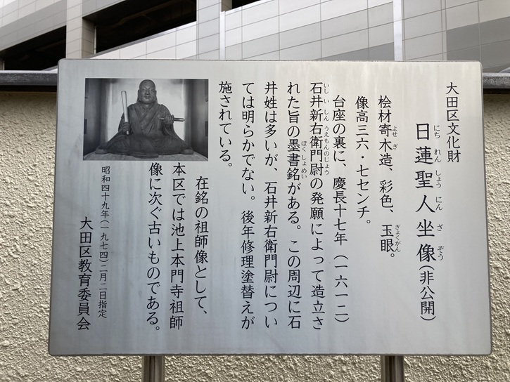 台座の裏に、慶長十七年(1612年)石井新右衛門尉の発願によって造立された旨の墨書銘がある。この周辺に石井姓は多いが、石井新右衛門尉については明らかでない。後年修理塗替えが施されている。在銘の祖師像として、本区では池上本門寺祖師像に次ぐ古いものである。