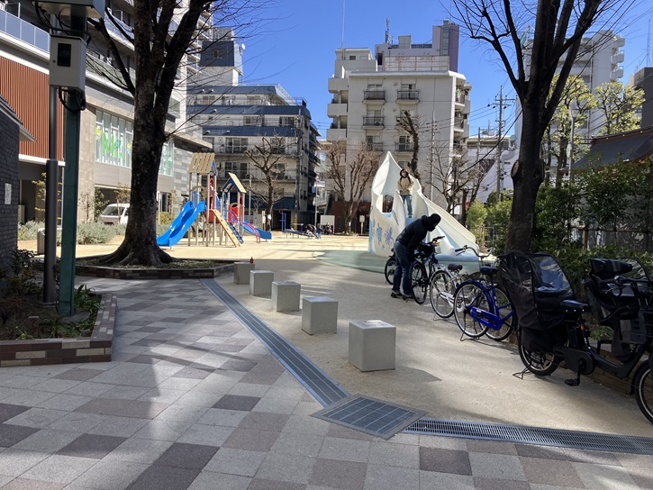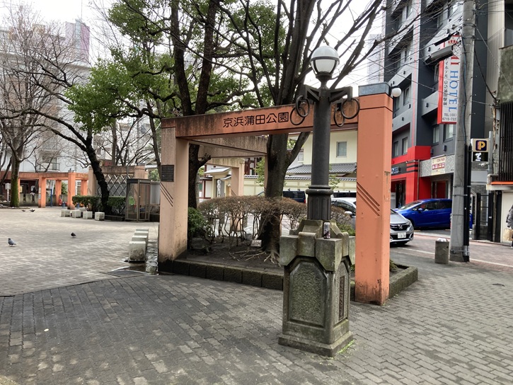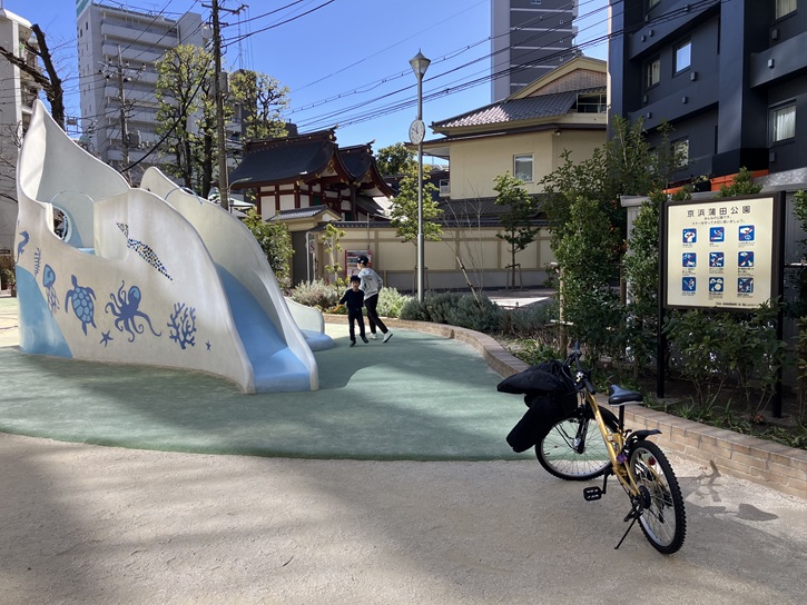 蒲田八幡神社の裏門の先に京浜蒲田公園があります。以前の京浜蒲田公園は薄暗い雰囲気であまり評判は良くありませんでしたが、「子供が安心して集まれる魅力ある公園」を目指して令和五年(2023年)4月1日にリニューアルオープンした後には明るくて綺麗で子供たちも安心して遊べる公園へと変わりました。