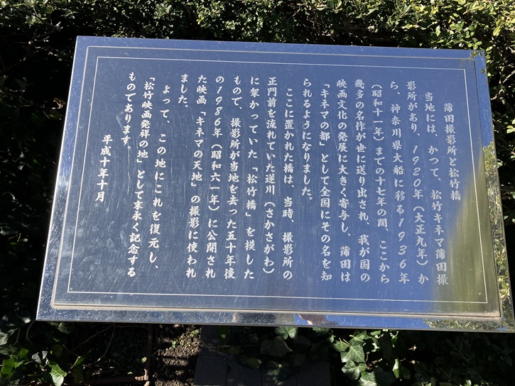 当地には、かつて、松竹キネマ蒲田撮影所があり、大正九年(1920年)から、神奈川県大船に移る昭和十一年(1936年)までの十七年の間、ここから幾多の名作が世に送り出され、我が国の映画文化の発展に大きく寄与し、蒲田は「キネマの都」として全国にその名を知られるようになりました。ここに置かれた橋は、当時、撮影所の正門前を流れていた逆川(さかさがわ)に架かっていた「松竹橋」を模したもので、撮影所が当地を去った五十年後の昭和六十一年(1986年)に公開された映画「キネマの天地」の撮影に使われました。よって、この地にこれを復元し、「松竹映画発祥の地」として末永く記念するものであります。