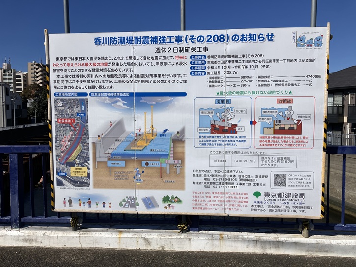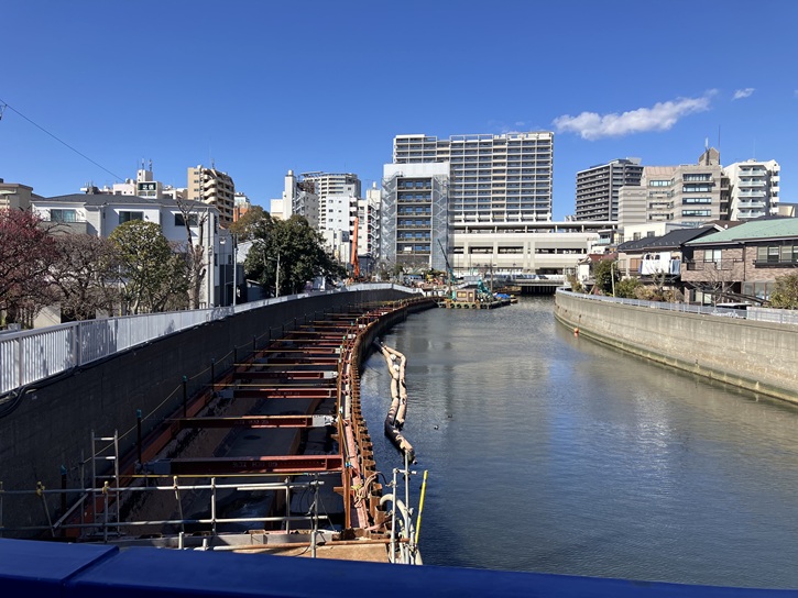 呑川の夫婦橋から天神橋までの区間では、現在防潮堤の耐震補強工事が行なわれていて、夫婦橋親水公園は資材置き場になっています。そのため公園内への立入りは出来ず、上の写真はその前に立寄った時の公園の様子です。