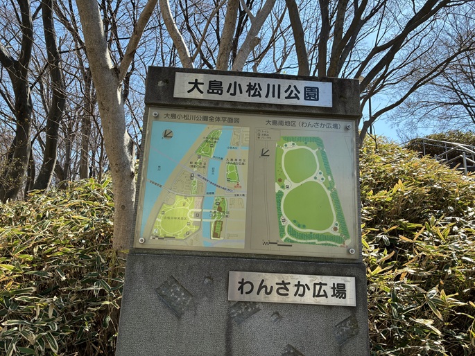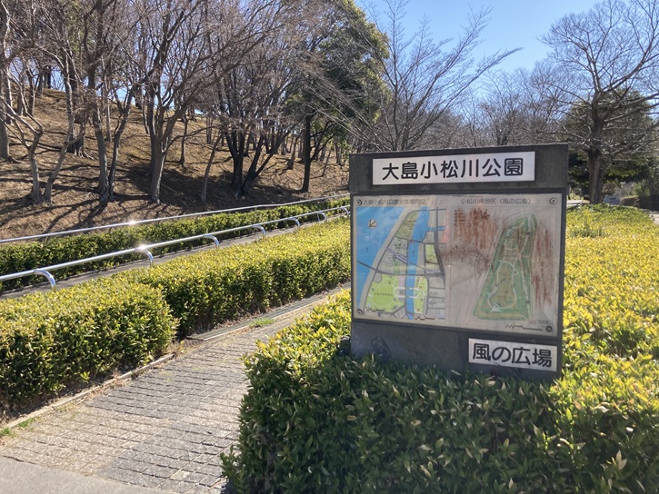 駅前広場の向かいの高台に大島小松川公園があります。公園は旧中川を挟んで江東区と江戸川区に分かれていて、江東区側には、テニスコート・野球場・サッカー場が併設されたスポーツ広場と広大な芝生が広がる「わんさか広場」があります。江戸川区側には、バーベキューなども可能な自由の広場・旧小松川閘門が保存された風の広場・季節の広場があります。かって、公園の周辺地域は海抜ゼロメートルの工業地帯でしたが、災害時の避難場所となるように土地の嵩上げが行われ、大規模な防災拠点公園として平成九年(1997年)8月1日に開園しました。