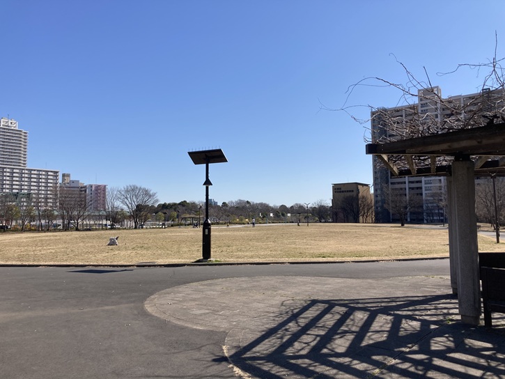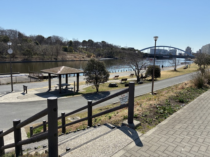 旧中川の河川敷には東屋も建てられています。夏には日陰で川風を感じながら休息できそうです。