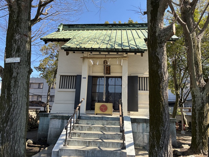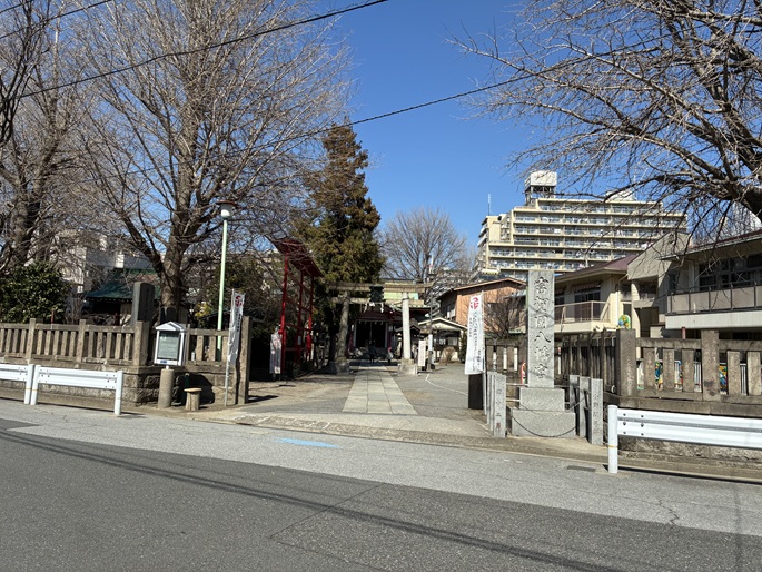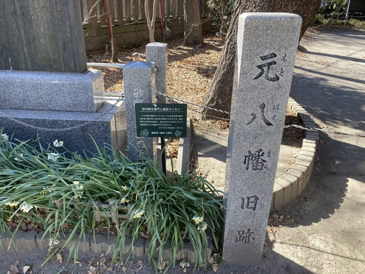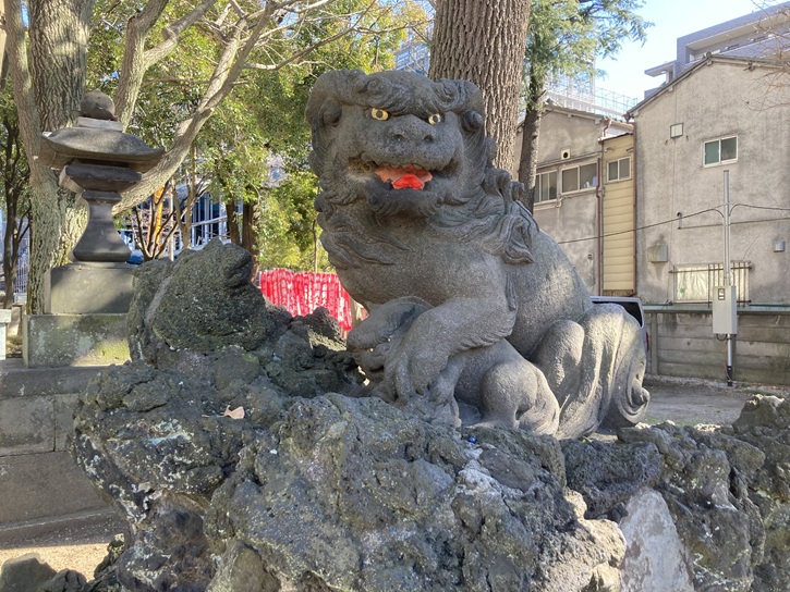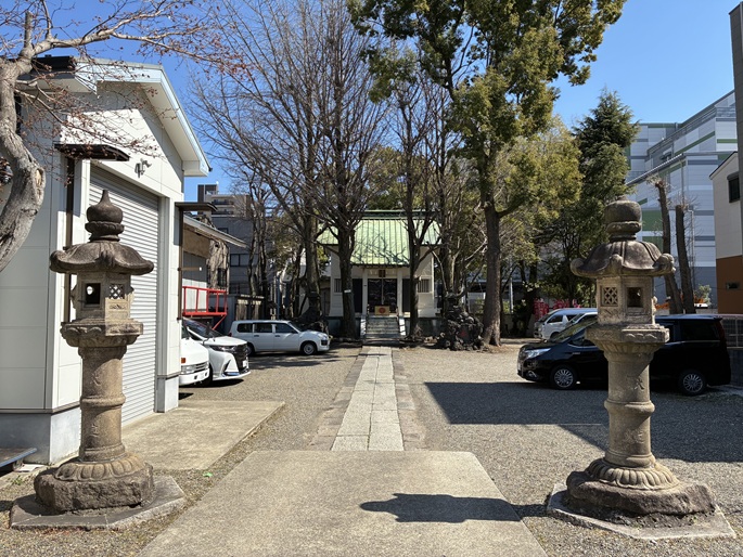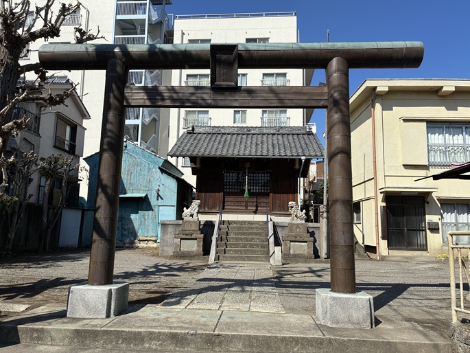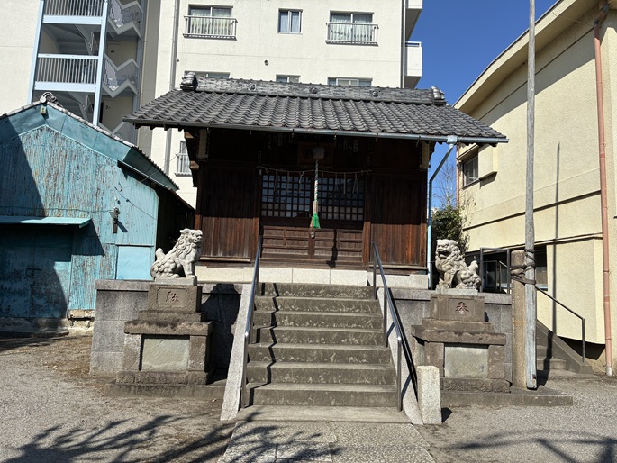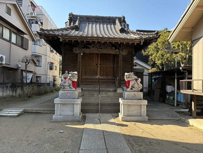 江戸時代初期に、深川八郎右衛門が開発した八郎右衛門新田の鎮守でした。拝殿前に鎮座している左右の狛犬は、子供の狛犬を抱いています。