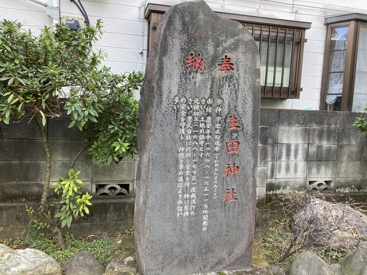 結構道に迷いながらも、路地奥の分かりにくい場所にある生田神社に辿り着きました。生田神社は、此の地を開拓した際に旧太郎兵衛新田村の鎮守として慶安年間(1648年〜1651年)に創建したといわれています。