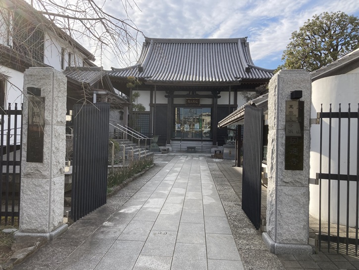 因速寺に隣り合って上妙寺があります。上妙寺は、寛永二年(1625年)に荻勘七郎が開基となって創立されました。荻勘七郎は大和国(現在の奈良県)の出身で、2人の弟と共にこの地を開拓し、「荻新田」と名付けました。その開拓地の一角に設けた寺が上妙寺の起源となっています。上妙寺には、海中から出現した鬼子母神像を安置していることで知られています。