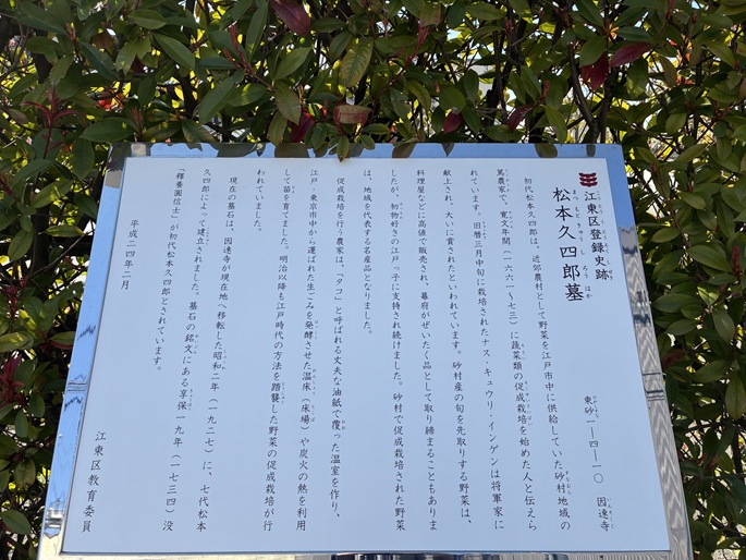 初代松本久四郎は、近郊農村として野菜を江戸市中に供給していた砂村地域の篤農家で、寛文年間(1661年〜1673年)に蔬菜類の促成栽培を始めた人と伝えられています。旧暦三月中旬に栽培されたナス・キュウリ・インゲンは将軍家に献上され、大いに賞されたといわれています。砂村産の旬を先取りする野菜は、料理屋などに高値で販売され、幕府がぜいたく品として取り締まることもありましたが、初物好きの江戸っ子に支持され続けました。砂村で促成栽培された野菜は、地域を代表する名産品となりました。促成栽培を行う農家は、「タコ」と呼ばれる丈夫な油紙で覆った温室を作り、江戸・東京市中から運ばれた生ごみを発酵させた温床(床場)や炭火の熱を利用して笛を育てました。明治以降も江戸時代の方法を踏襲した野菜の促成栽培が行われていました。現在の墓石は、因速寺が現在地へ移転した昭和二年(1927年)に、七代松本久四郎によって建立されました。墓石の銘文にある享保十九年(1734年)没「釋養圓信士」が初代松本久四郎とされています。